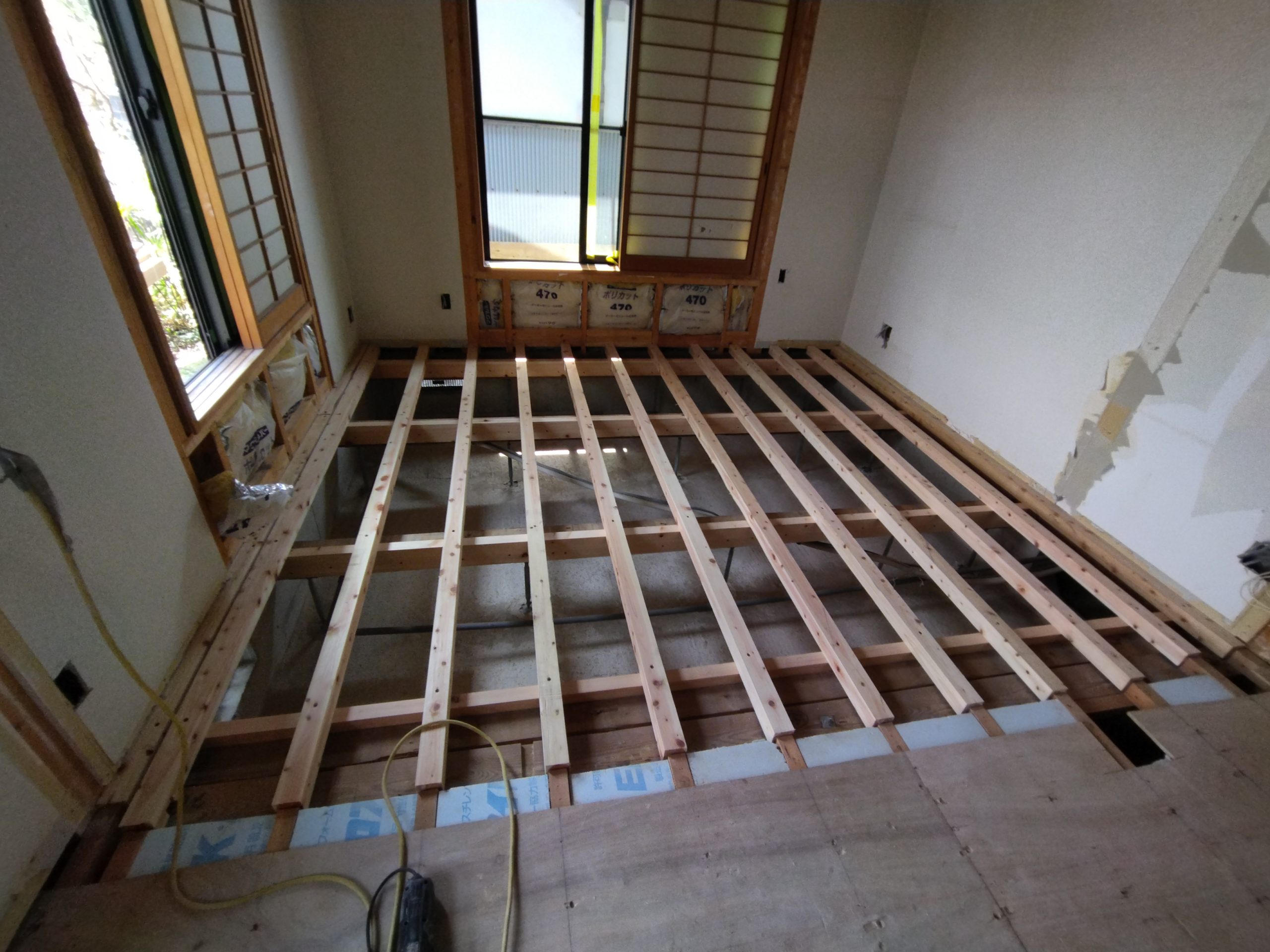奈良市のリフォーム工事では床の張替え作業が進んでいます。もともと和室だった空間はフローリングとの段差がないように、床板の下に渡している根太の高さを下げて施工されていました。造り手の配慮が感じられます。