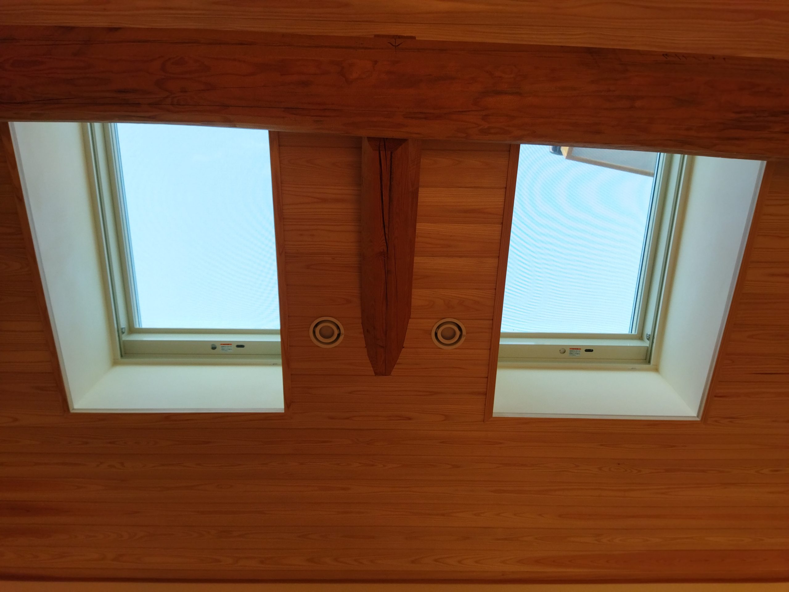 その要素として、大きな2つの天窓の役割が大きいのかなと感じます。天窓からは壁面の窓よりも多くの光が入り、日中は電気に頼らずとも室内が過ごしやすい明るさになっていました。