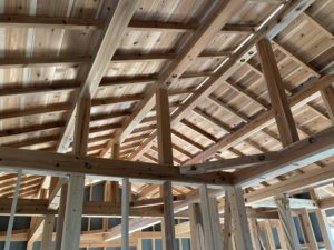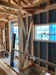 筋交いや外部の耐力壁、梁の仕口の補強金物など、