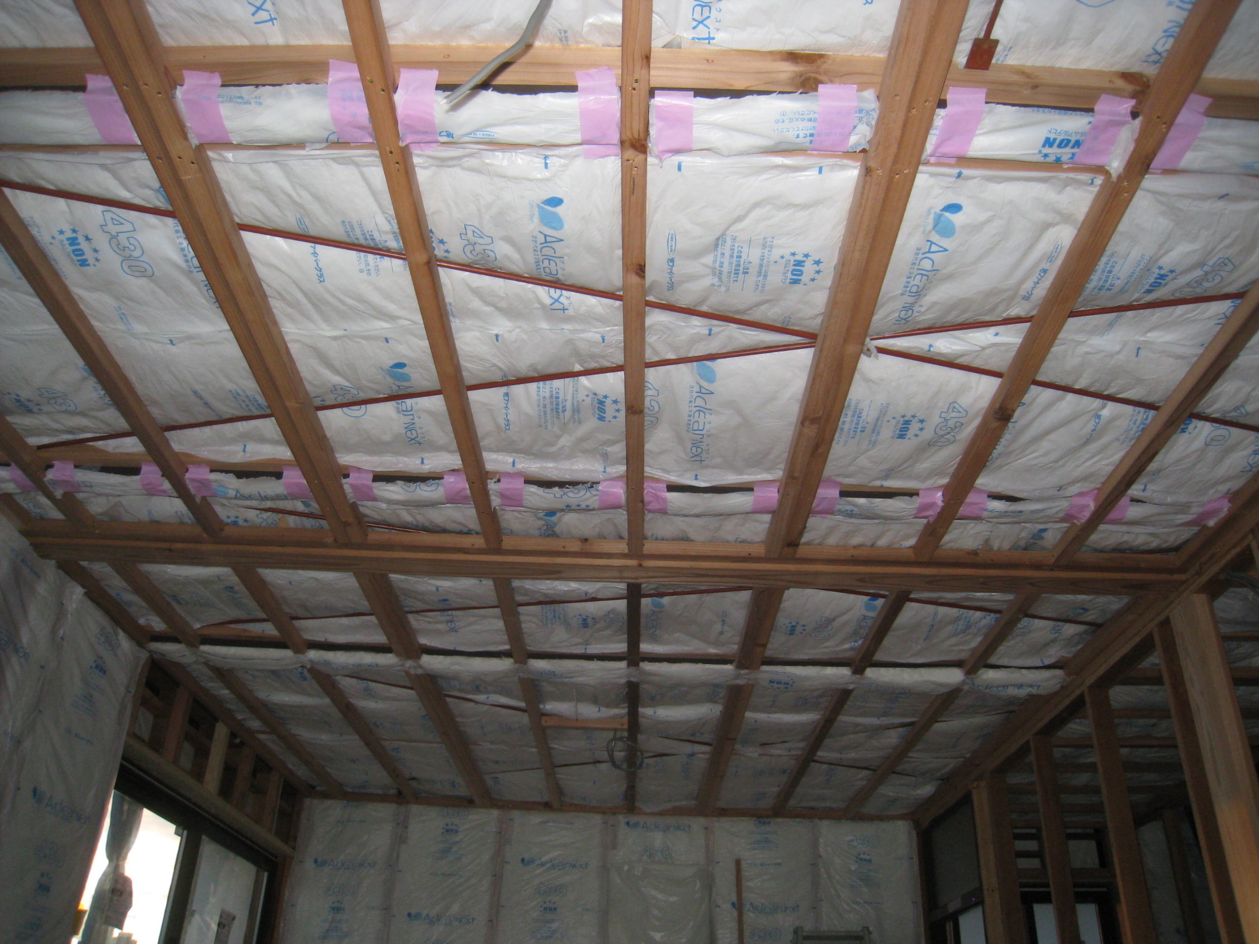 2階の天井はほぼ施工完了。続いて外壁の断熱材に取り掛かっています。