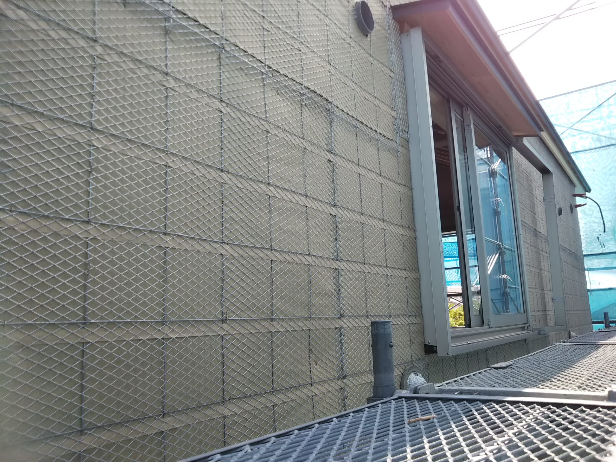 塚口町の家新築工事では、外壁の左官工事に向けて、ラス工事が完了しました。
