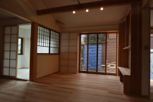 ロフトや外部にも木製の建具を使った家です。
