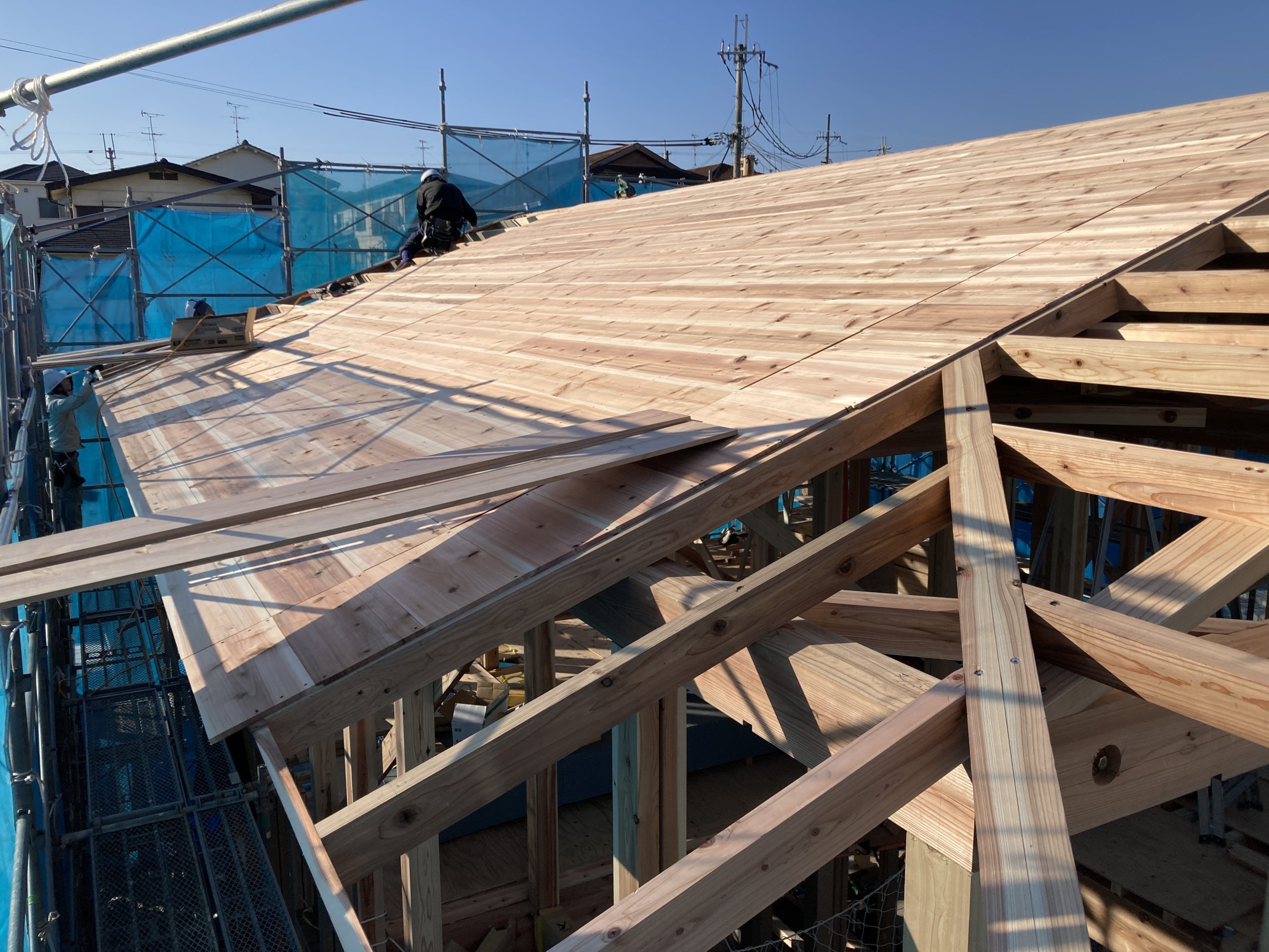 建て方では応援大工さん3人に来ていただき、社員大工と合わせて5人での作業、上棟の日には社員大工も全員揃い、6人で屋根仕舞いと屋根やさんによる遮熱防水シート施工まで完了することができました。
