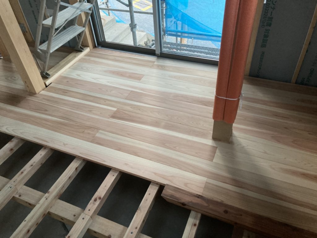 無垢板無塗装で木のぬくもりが感じられる床板を、大工さんが丁寧に敷き詰め張ってくださっています。
