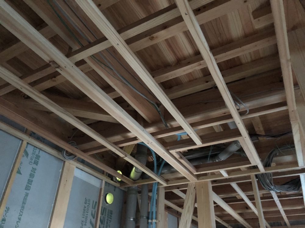 三郷町新築のお家では、大工さんが天井下地組み作業、それに合わせて電気配線や一部の配管作業がされています。