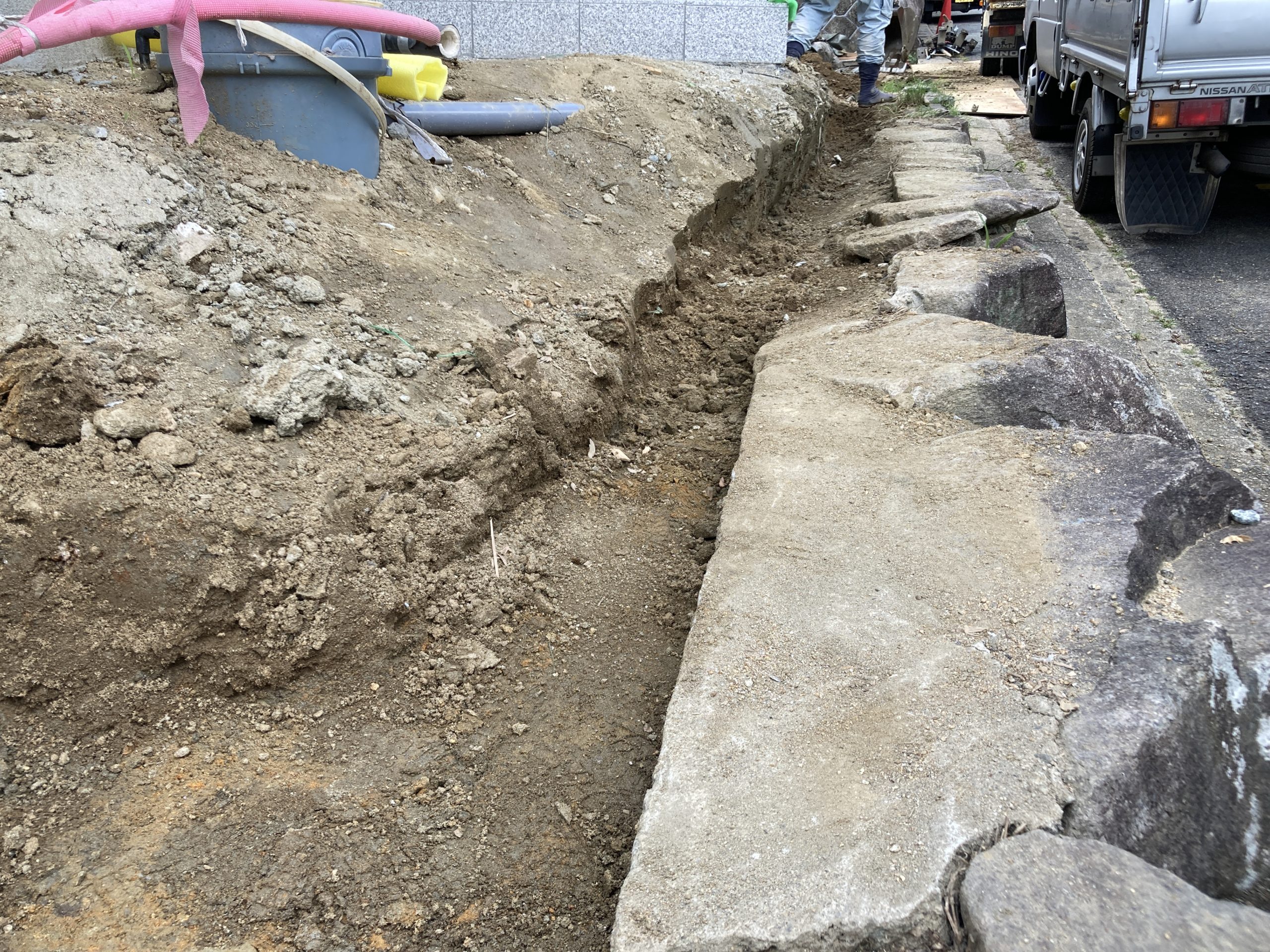 重機を使ったり、手作業で土を避けたりと大変な作業ですが、仕上がりを見越して下準備する大切なところです。
