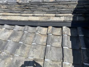 瓦を正しい位置に戻し、元々の瓦の掛りの浅い部分に水切りのガルバリウム鋼板を差し込みました。