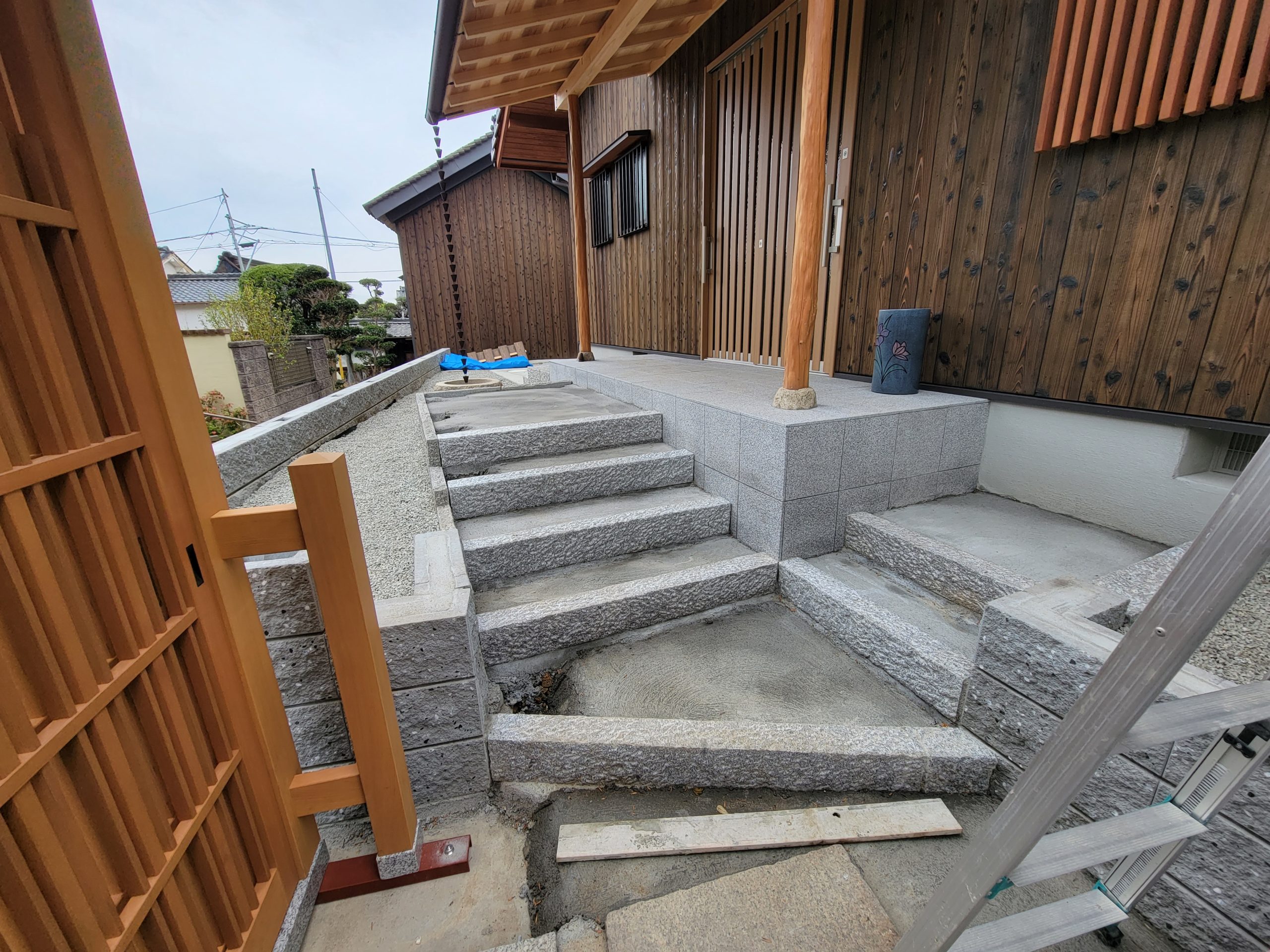 最近の現場では珍しく、門があり、アプローチも御影石と洗い出しを組み合わせたしっかりとしたつくりとなっています。