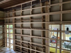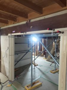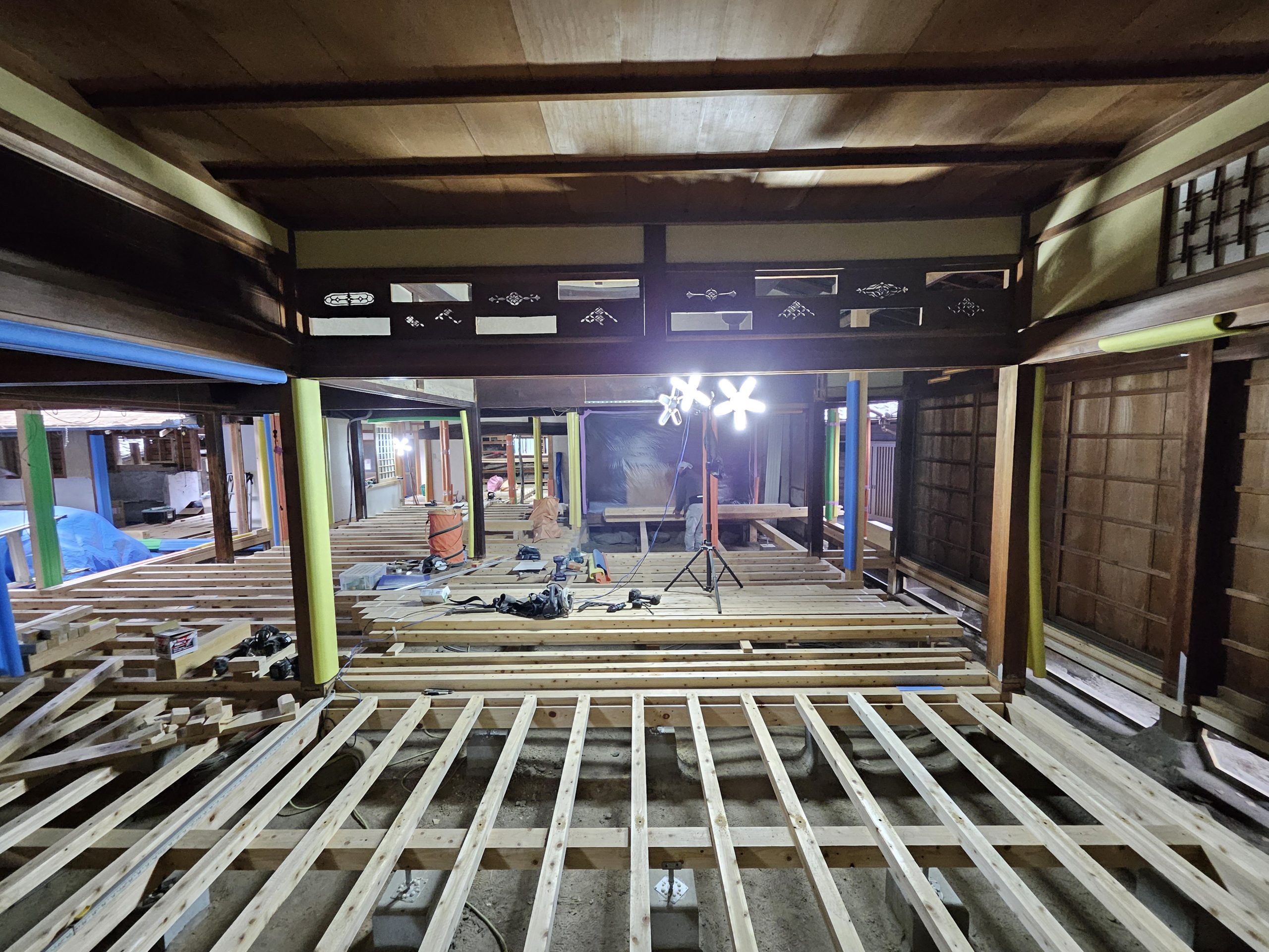 五条市の工事は、3人の大工さんにより、床板(杉の無垢材)を貼り終わった後から、壁の下地や天井の下地、押入の造作等を進めています。