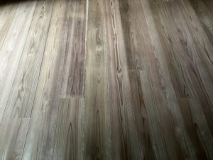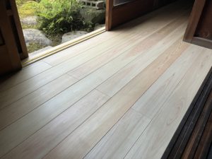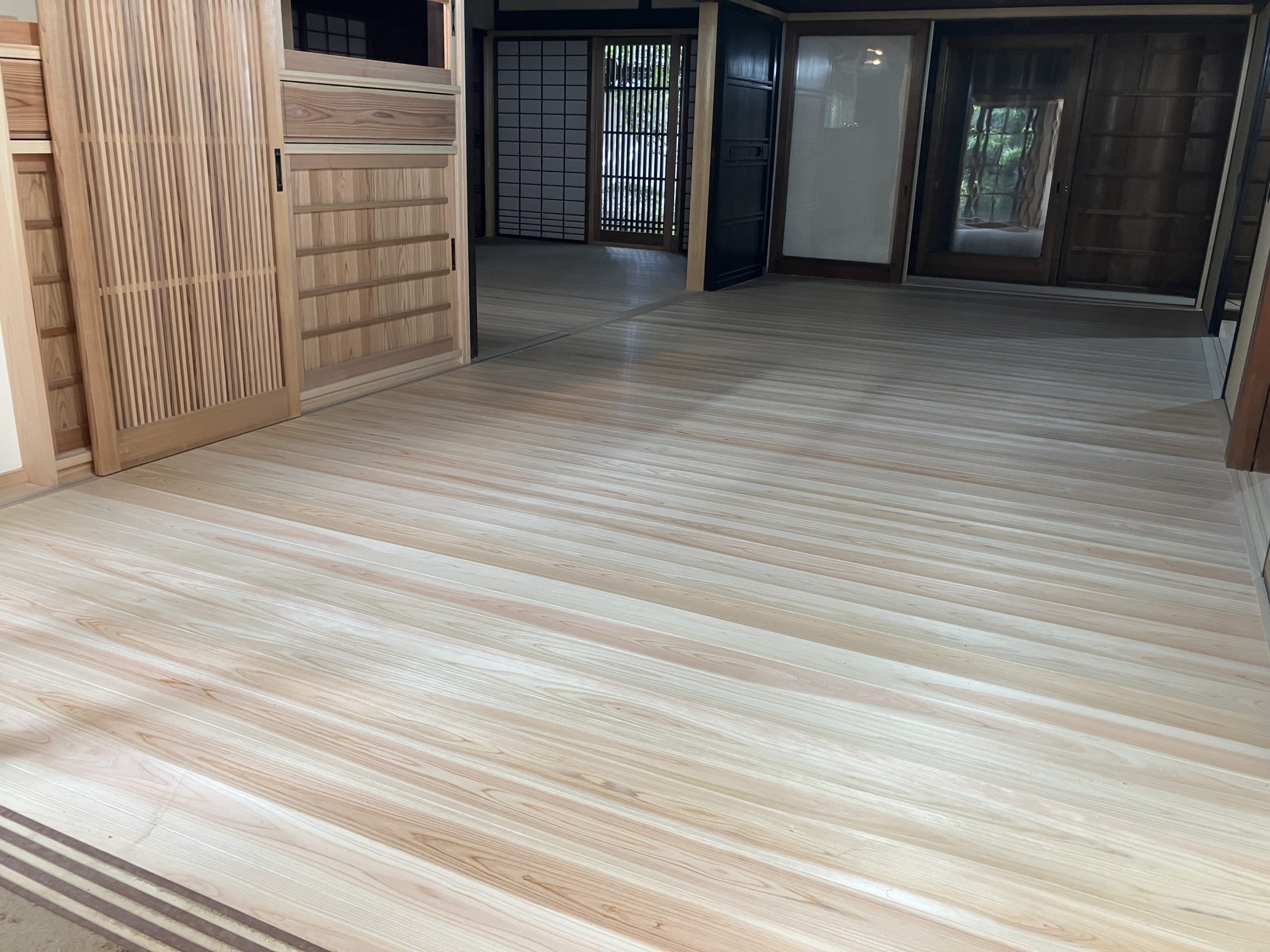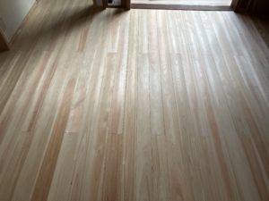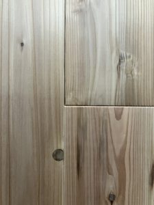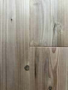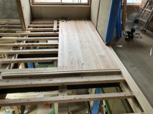 もうすぐ完成の香芝市のリフォーム現場では、杉の床板と桧の床板を張り分けました。