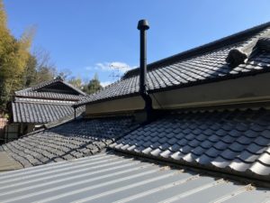 薪ストーブの煙突位置やガラス瓦の納まりなど