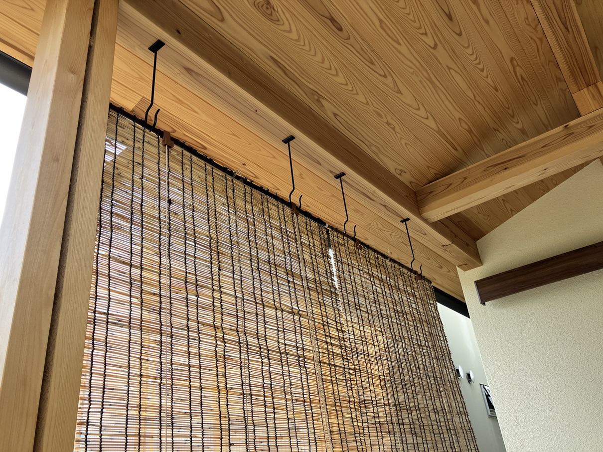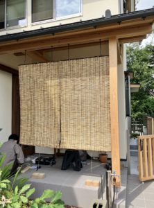 日差しを遮り、風を通してなおかつ道路からの視線も遮るアイテムとして、簾を施工させていただきました。
