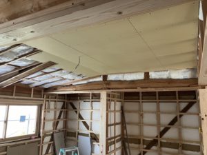 古民家の現場で断熱材を入れてボードを施工している途中です。