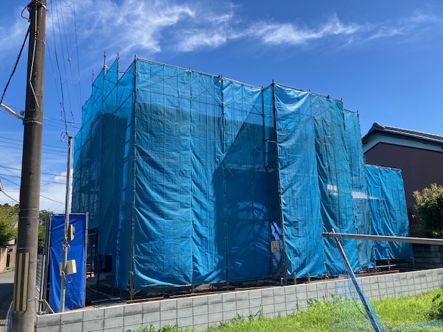 上棟が終わった現場は写真のようにブルーシートで覆われ、暑さがこもります。