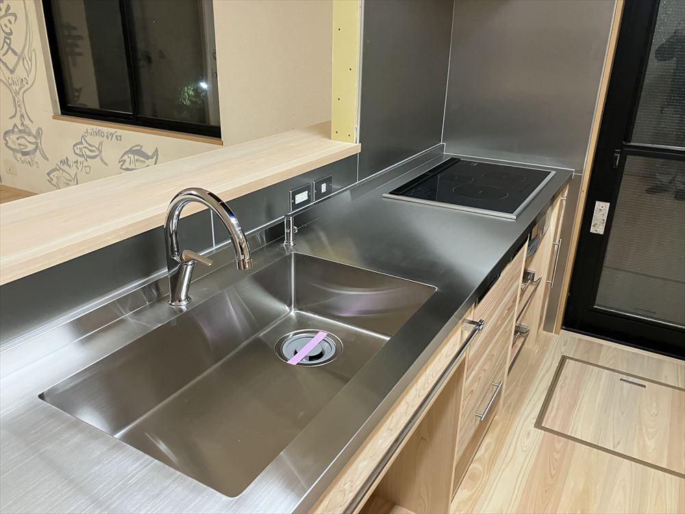 ステンレス天板は今回オーダーメイド品の物を取付だったため、台は大工さんに天板に合わせて造作して頂きました。