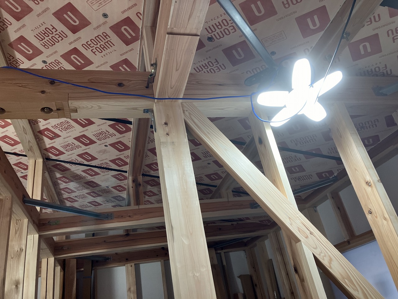 屋根の断熱方法は、母屋間に断熱材を取付て
