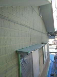今回の外壁は左官仕上げのため、Wラスという金網みたいなのを次に施工します。