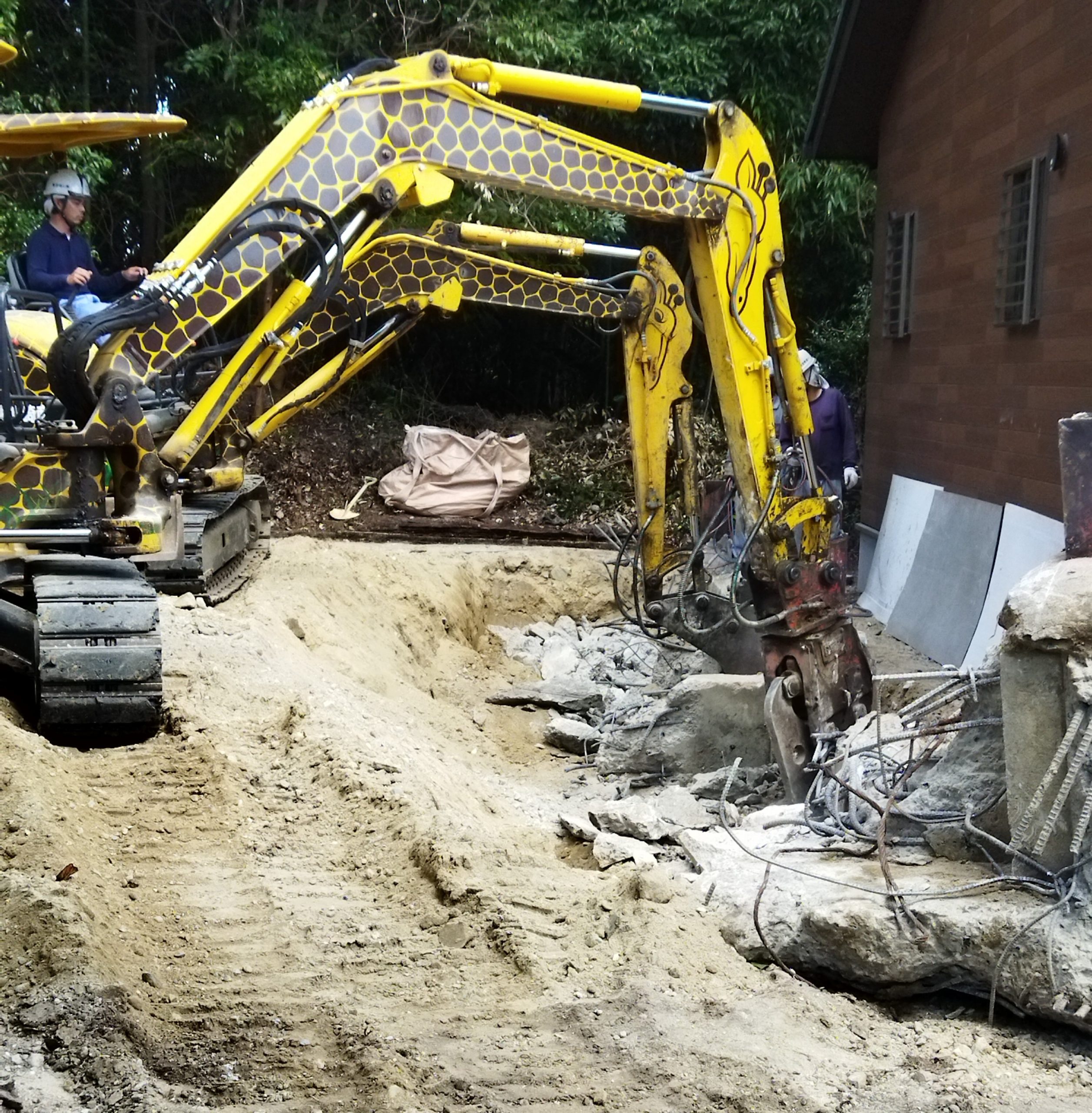 矢田町のお家で基礎の解体工事をしています。解体前は倉庫だった建物を2階建ての住居にする計画で、重機で元々あったコンクリートを割りながら鉄筋とともに少しずつ撤去しているのですが、予想外に「地中梁」がありました。