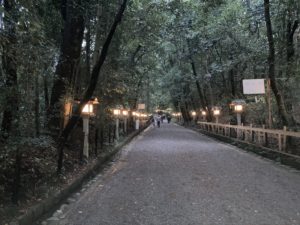 灯篭に明かりがともった参道もいいものです。