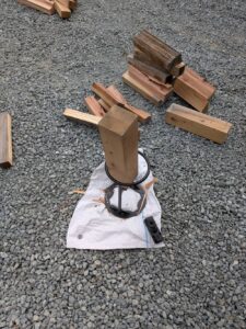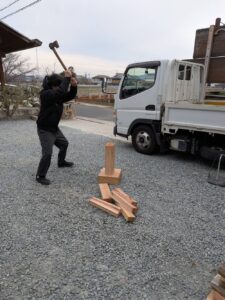 そのため、材木をカットする必要があるのですが、弊社には女性も多いので、薪割りが簡単に(?)できる道具が導入されました。
