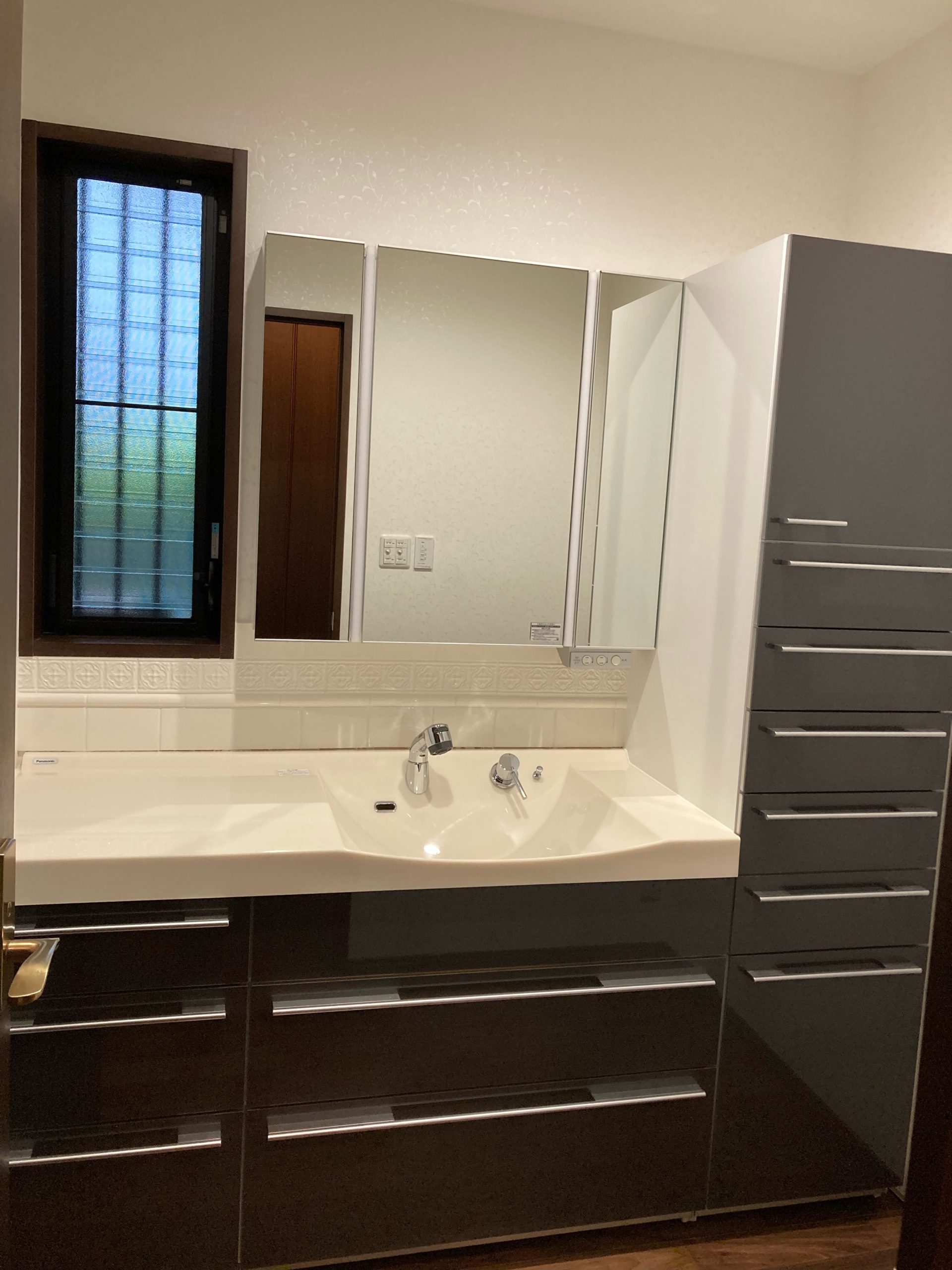 収納たっぷりのパナソニックの洗面化粧台。平田タイルさんのタイルもすてきです。