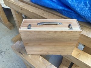 工夫した点は軽さ重視で杉を出来るだけ薄くして使った点と、アタッシュケース型をイメージして作ったので、運搬時にはケースが真横を向く事になるので、収納時には各小部屋を完全に隔てる構造にした事でしょうか。