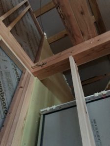 天理の新築では、断熱性能を高めるために、石膏ボードを小屋裏も土台までも張り上げてもらっています。