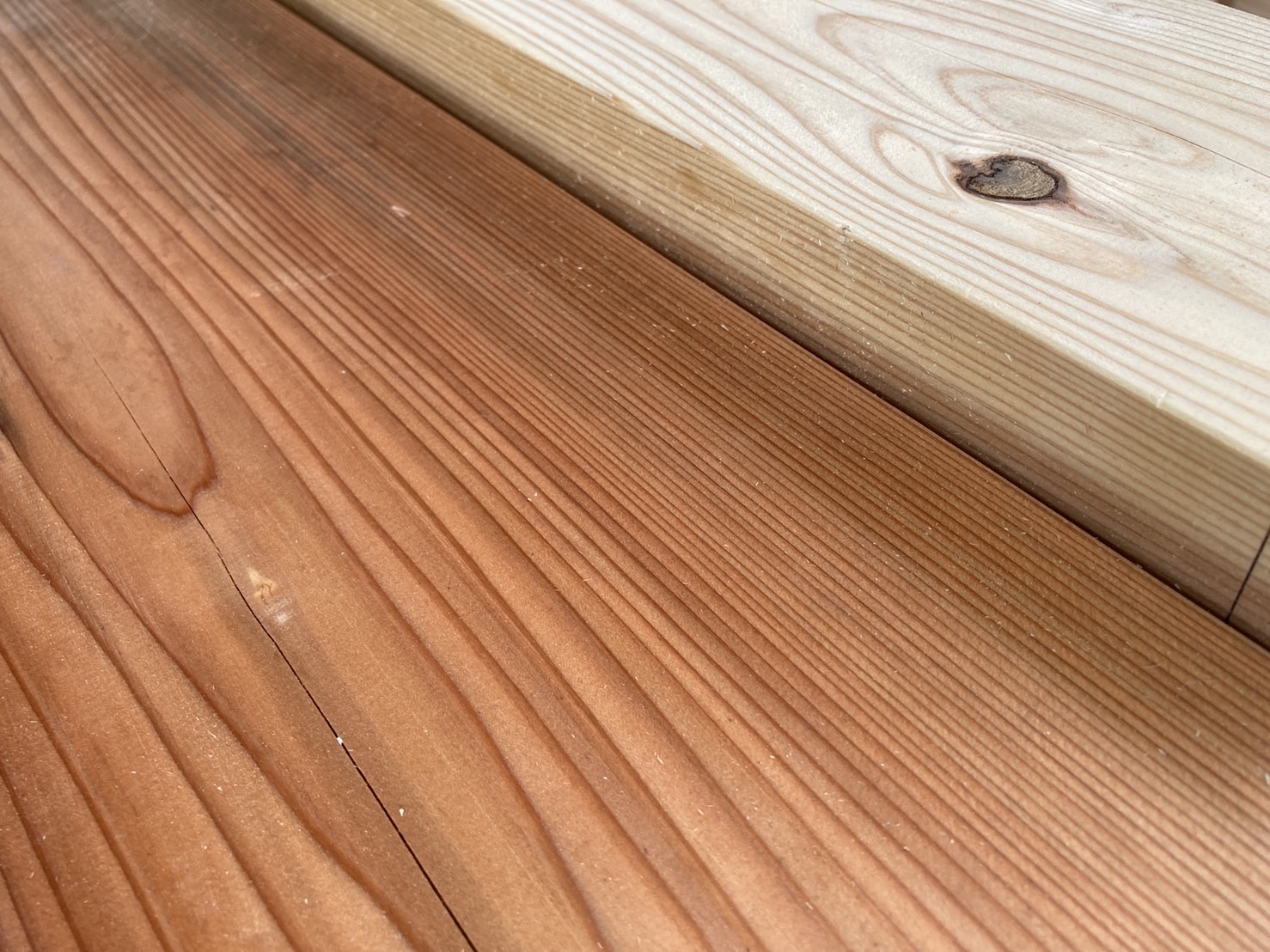 これらの色の違いは、片方が不良品とか病気持ちの木だったといったわけでなく、杉の木は中心が赤く外側が白くなるという特徴があるため、どこで切るかによって表面に見えてくる色が変わってくるためです。