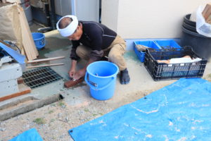 休憩時には直ぐに道具の手入れでノミを研いでいる姿など