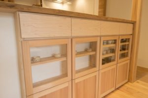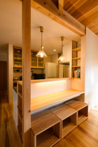 このように対面キッチン前の少しのスペースでもさまざまなことができます。ですので、お施主様の好みや用途に合った収納スペースをご提案できるようしっかりとヒアリングをしたいと思います。
