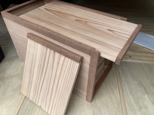今回の小さなチャレンジはスライド式蓋とイモ接ぎと二枚組接ぎの竹釘止めです。