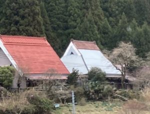 こちらは茅葺屋根のお家(今は茅の葺き替えが大変なので、トタンを上から貼ってあります)ですが、茅葺でも雨がしっかりと流れるように勾配を急にしてあり、かつそれによってできた大きな屋根裏空間は蚕の養殖のための空間として使われたりしていました。妻側に小窓があるのはこの屋根裏空間の換気の為です。