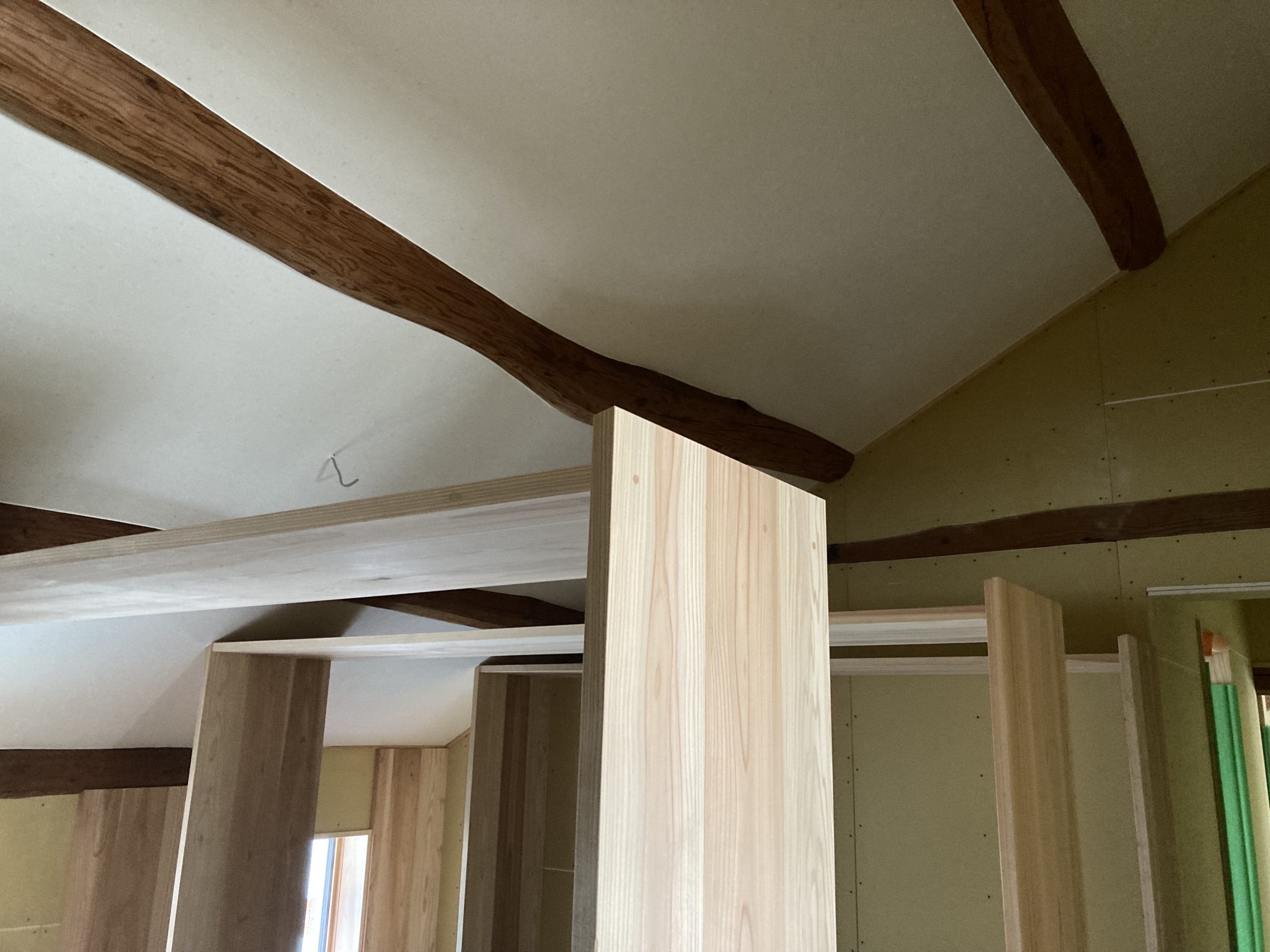 木工事が終わり、内装工事(クロス工事・左官工事)や建具の吊りこみ、照明取付等に取り掛かっておりあと一か月で完成します。