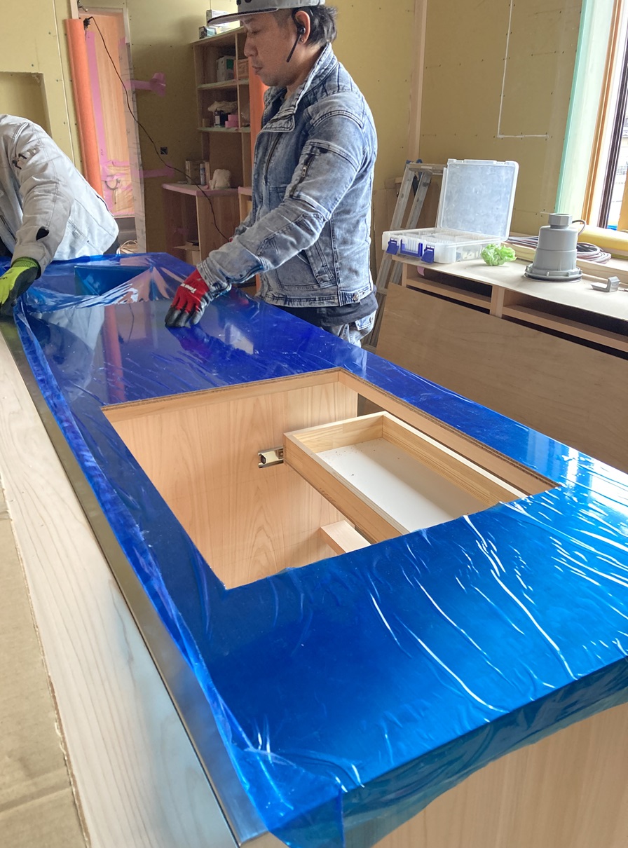 事前にミリ単位で枠材の位置を大工さんに設置してもらい、ステンレスメーカーさんには天板をどのくらい巻くか、も含めて現場で一度打ち合わせをして、図面で確認をすすめていましたが、設置当日、すっぽり綺麗に天板が架台に載った瞬間、ホッとしました。