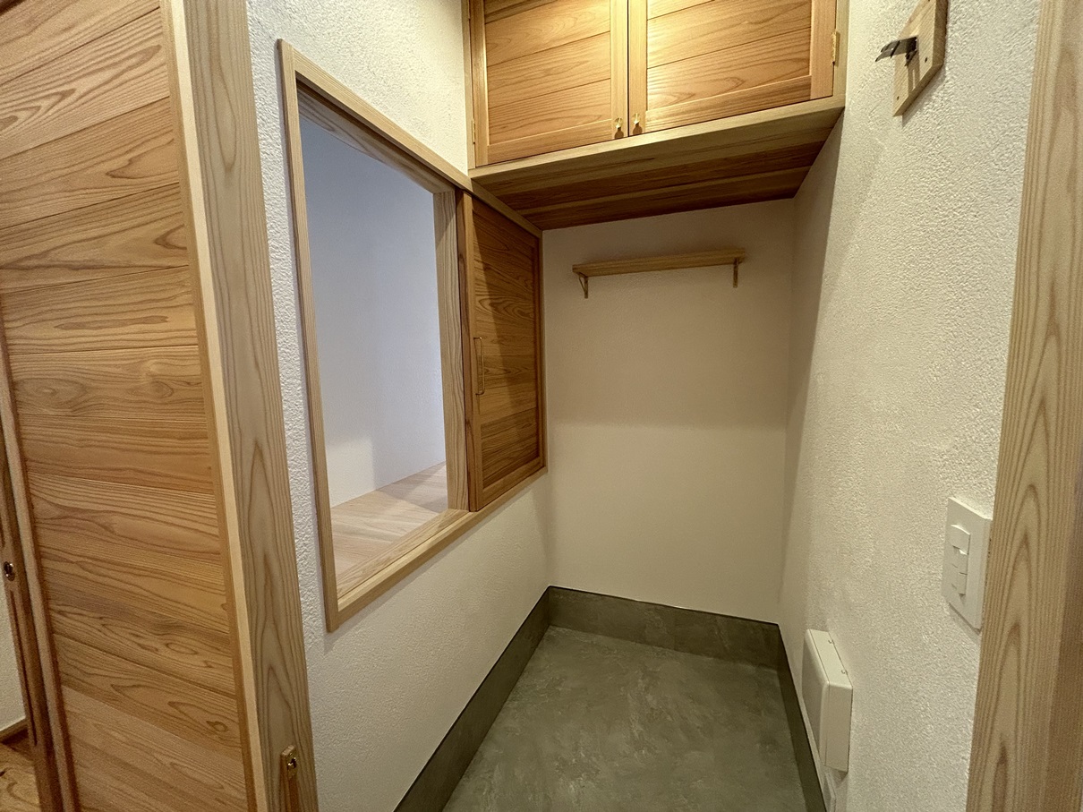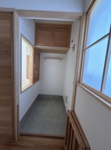 犬のトイレスペースには、収納が隣接しています。この収納は車庫側から出入りする勝手口につながっているスペースとつながっていて、買ってきたペットシートのストック場所も兼ねた便利な動線になっています。(収納スペースは上段と下段に分かれており、下段のほうはトイレ収納ですので、トイレットペーパーもストックできるようになっています)
