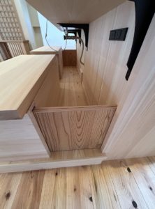 また、犬が勝手に部屋に入らないように、リビングに面する建具は錠をかけられるようにしています。造作家具のキッチンカウンターのベンチにも犬の侵入を防ぐ引戸を付けさせていただきました。キッチンに侵入しないようにする格子戸も取り付け予定しています。