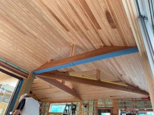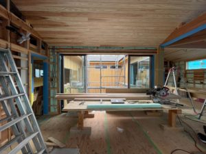 屋内は杉の羽目板張りが進んでいます。