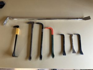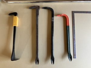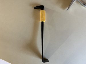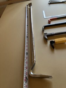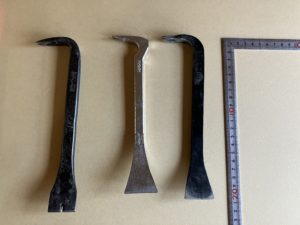 このバール頭の角度が絶妙でめっちゃ使い易いんですよ。写真はないですが、60cmと45cmの3本を揃えてます。色々試しましたがほんの少し角度が違う、形が違う、重さが違うで仕事の質がまるっきり変わるんですよ。無理をすると躯体が傷んでしまったり、必要以上に傷をつけたりしてしまうので使い分けが大切です。