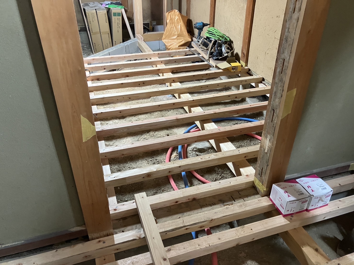 田原本のリフォーム工事では、解体が終わり床組と給排水工事、電気工事が進んでいました。