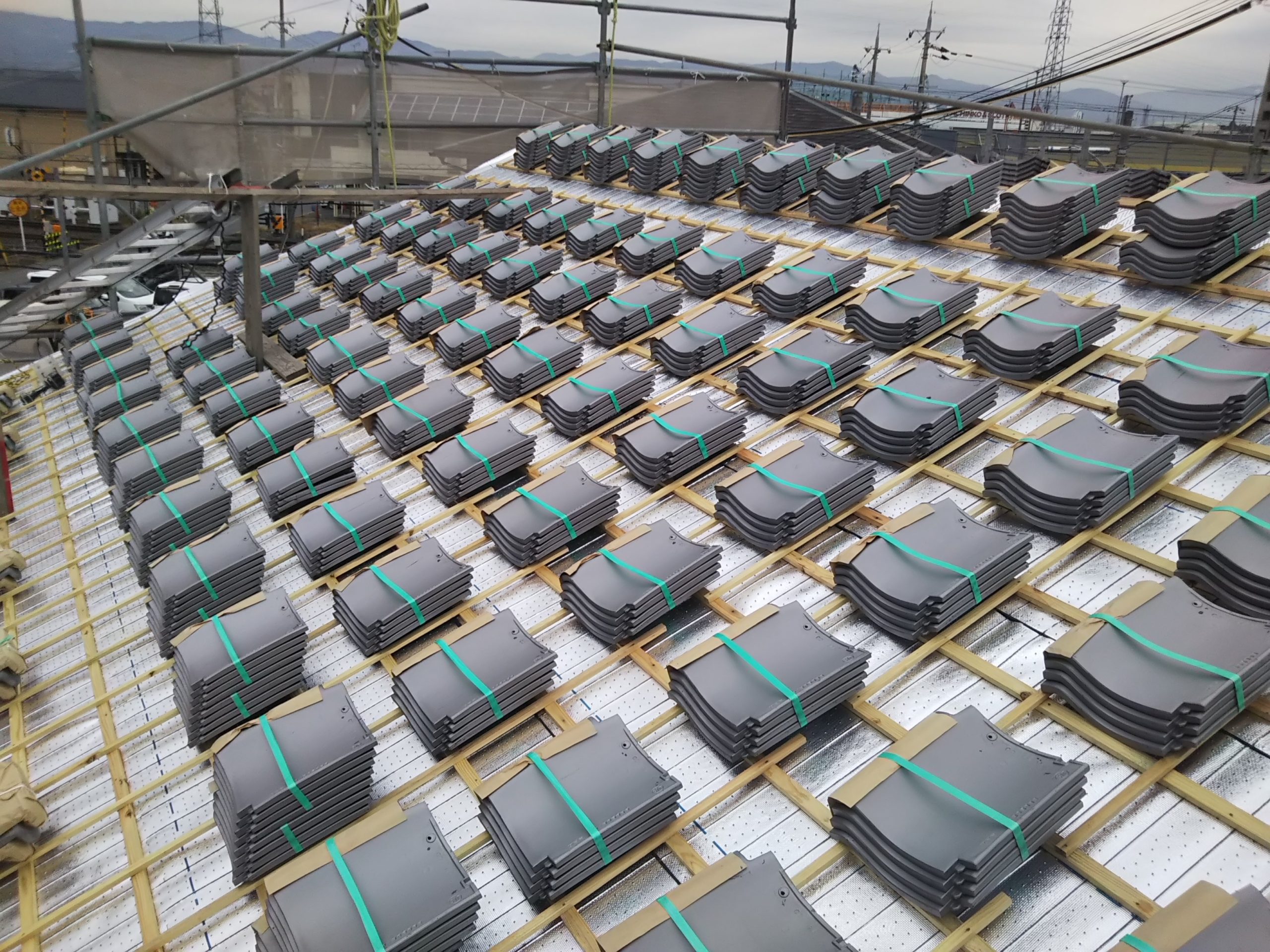 ルーフィングと瓦桟の作業が終わったところです。