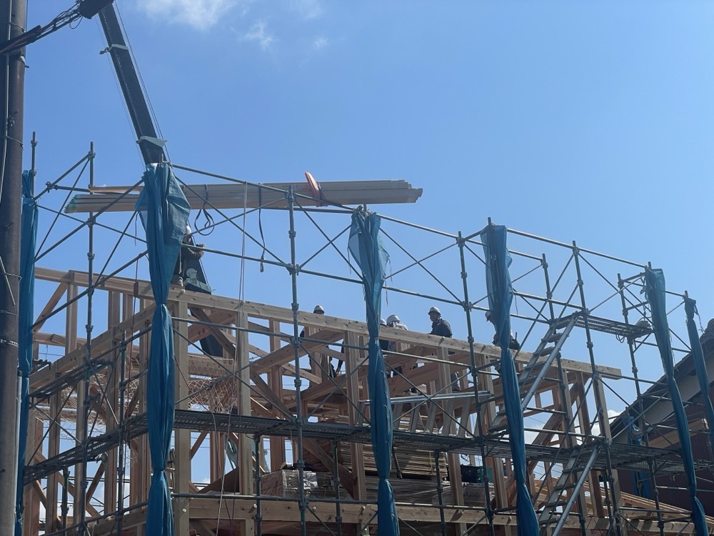 「大黒柱のある子育て世帯の家」では、23日から建て方が始まり24日に上棟いたしました。