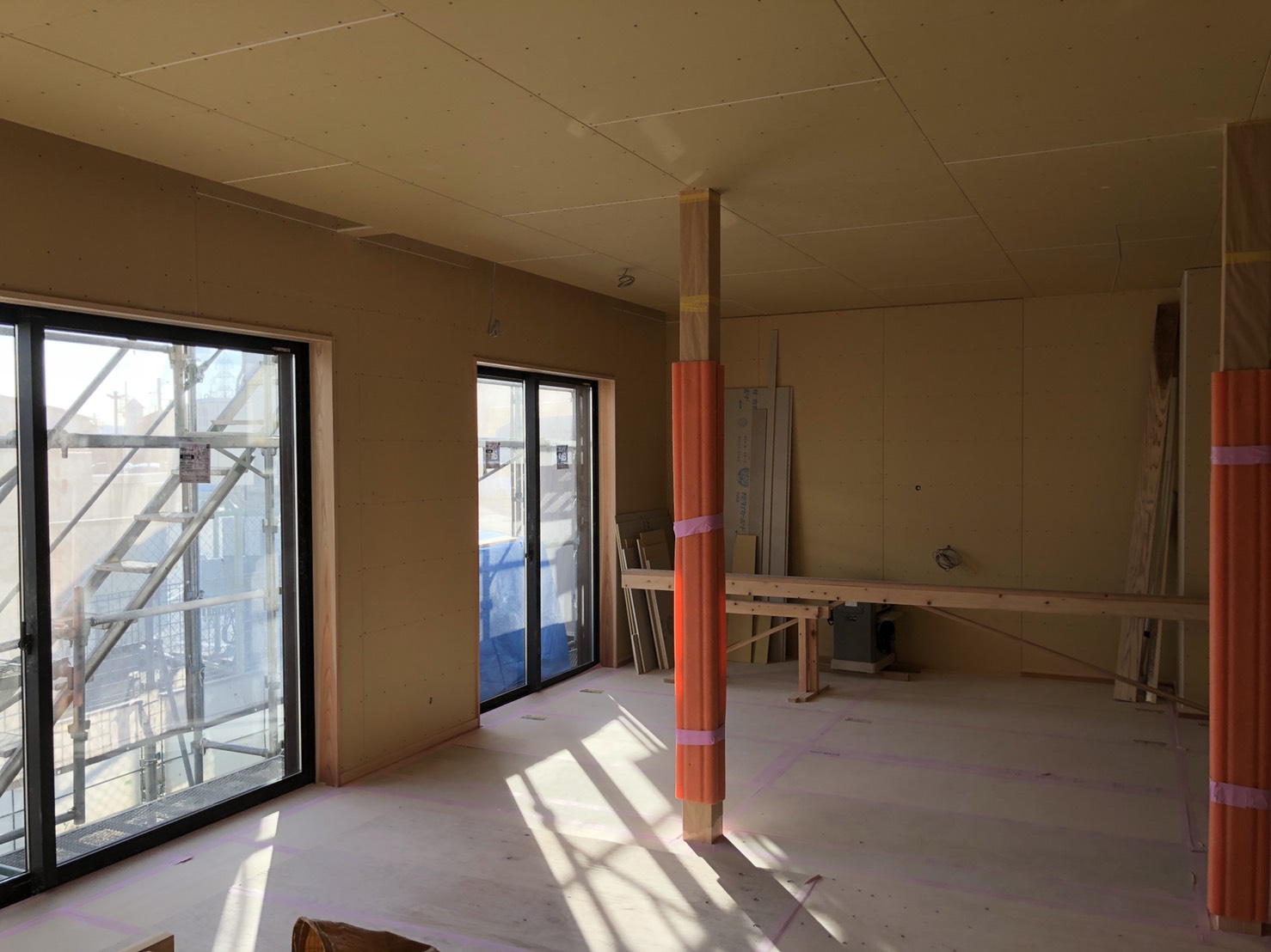 工期も予定通り進んでおり、今月末で大工仕事は終わりとなります。内壁のボードもほとんど張り終え、形が出来上がってきました。