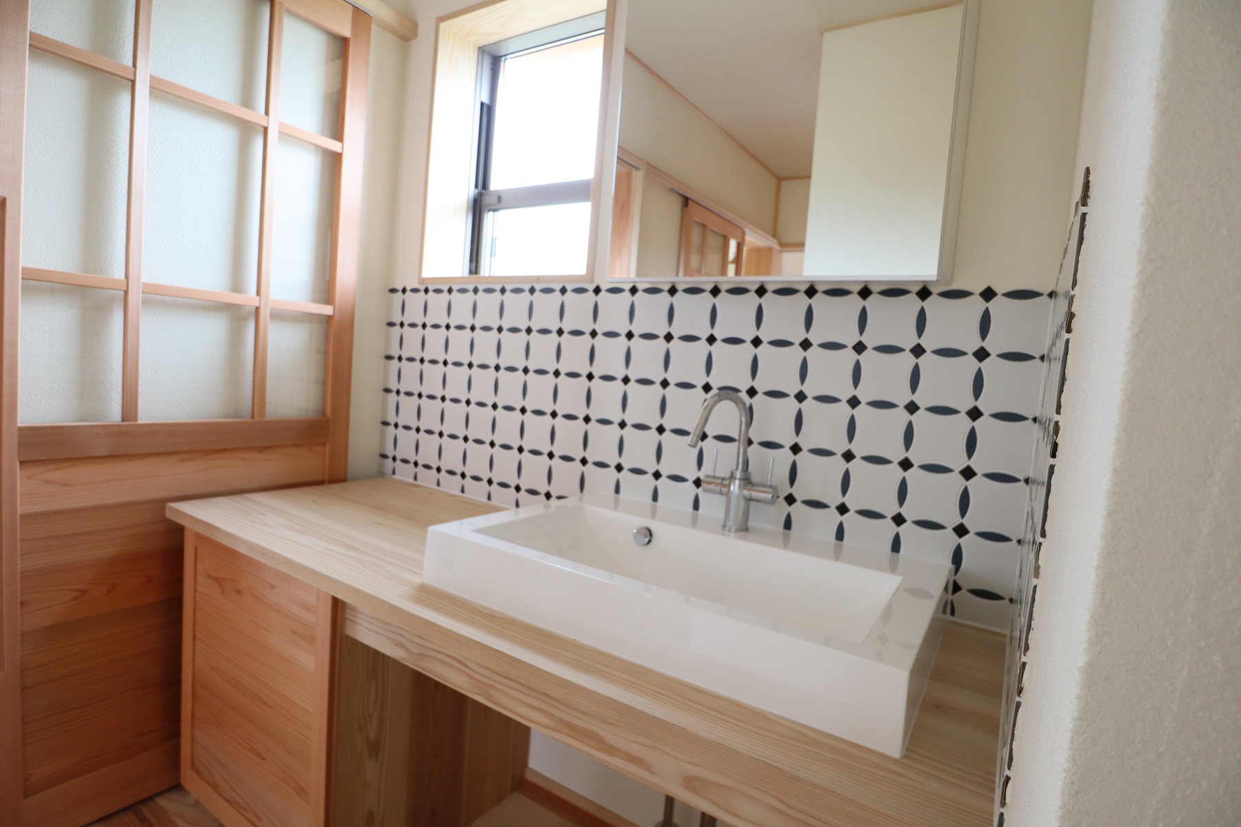 輪和建設の阿部です。写真は水回りに部分的にタイルを入れた事例です。 洗面台の壁に貼ったタイルは、幾何学模様で深い緑色が印象的です。タイルは大きさ、素材、色、形などいろいろなバリエーションがあります。お客様に好みのものを選んでいただくため、いつも異なるタイルで出来上がりが楽しみです。漆喰の白い壁と無垢の杉板の空間の中に、こういったキレイな色味が加えられると、見ていても楽しいです。毎日過ごす場所にときめきがあると嬉しいですね。