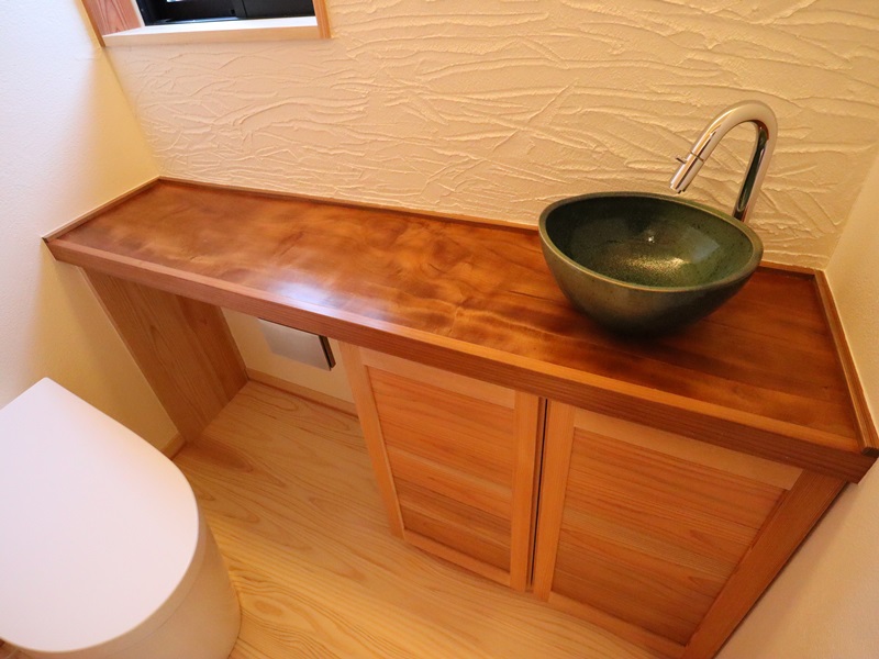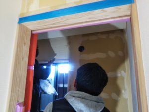 壁をホタテ漆喰で仕上げているのですが、お客様のご希望で、一面だけアクセントになるようにコテむらをつけた仕上げにしました。