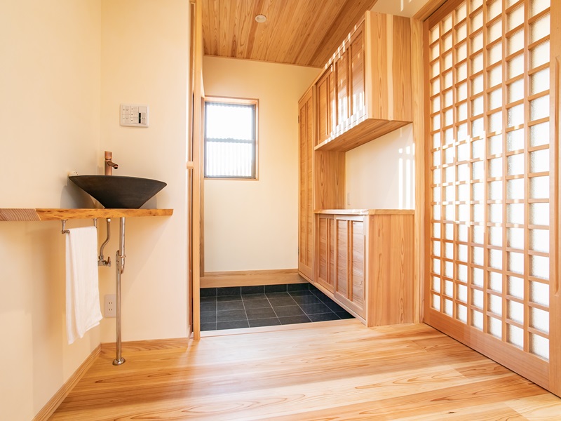 玄関から洗面室までが遠いことや、お客様が手を洗ってから家に上がるという習慣があることからこの位置に手洗いを設けました。コロナ流行前に竣工した物件ですが、今となっては感染対策という点でとても有効です。