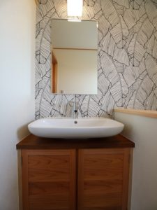 タンクレスのトイレはトイレ本体に手洗いがついていないので、トイレ内に別に手洗いをつけることが多いです。壁に埋め込むような既製品もスペースに無駄がなくよいのですが、無垢天板にお気に入りの手洗いボウルを乗せるのも趣があり良い感じです。トイレに座った際に、ボウルの側面の美しい柄がよく見えます。