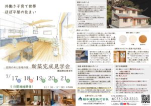 7月17・18・19・20・21日に田原本町で『共働き子育て世帯ほぼ平家の家』新築完成見学会を開催します。今回は家具を設置するのでより生活のイメージがつきやすいかと思います。