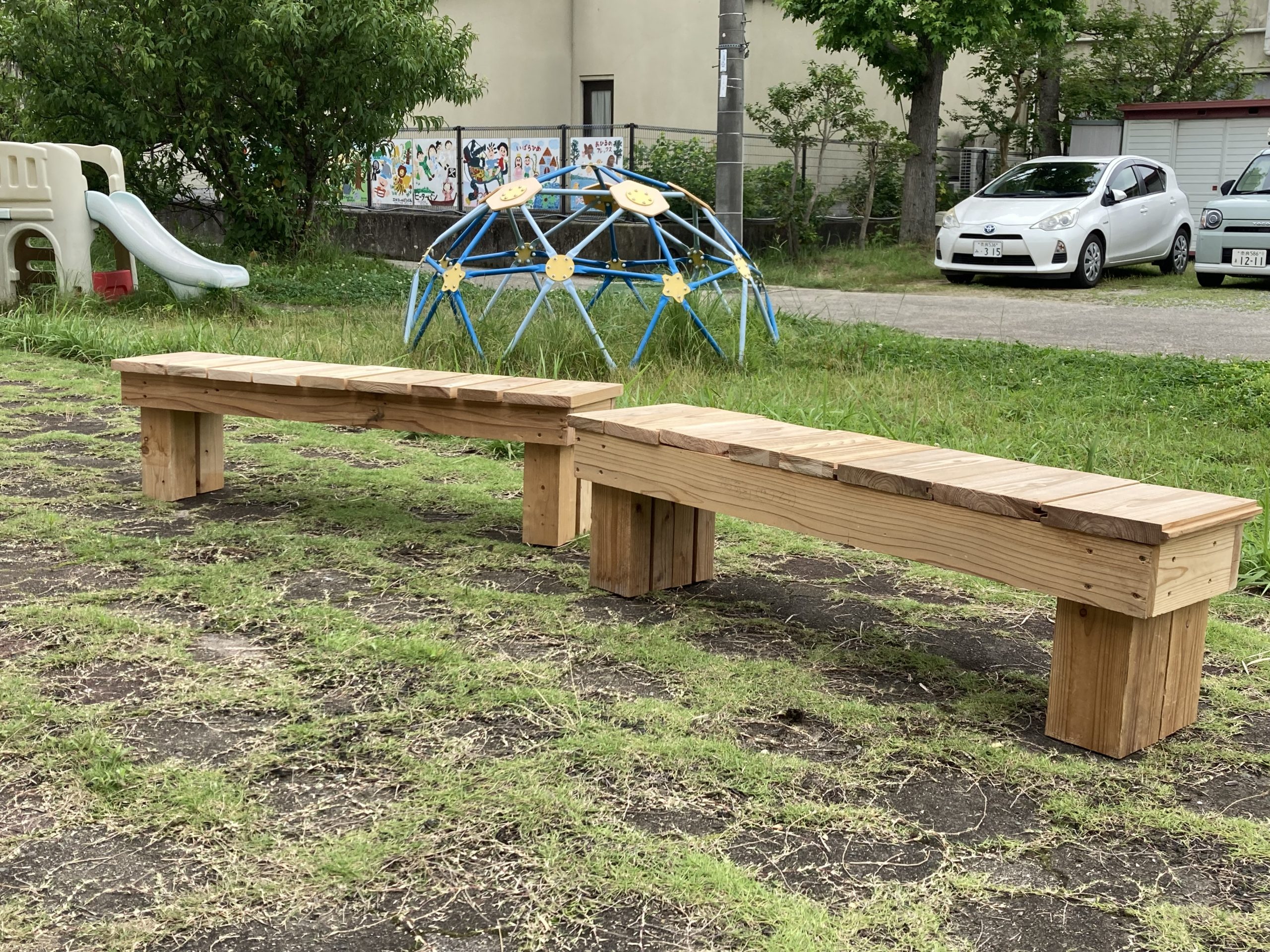 はじめはベンチと聞いて、難しいんじゃないかとか、時間が足りないのではと思っていましたが、やってみると意外とできるもので子どもの喜んでベンチに座る姿をみるとやってよかったと思えました。