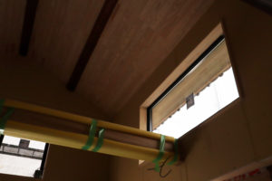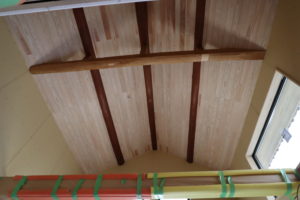 先日現場に行った際には、リビングの吹抜けの羽目板が貼られ、上部の窓からは空が見えました。とても開放感のある空間になりました。