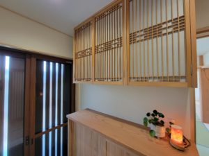 こちらは書院に使われていた障子を再利用し、下のカウンター部も欅の地板を削り直したものです。